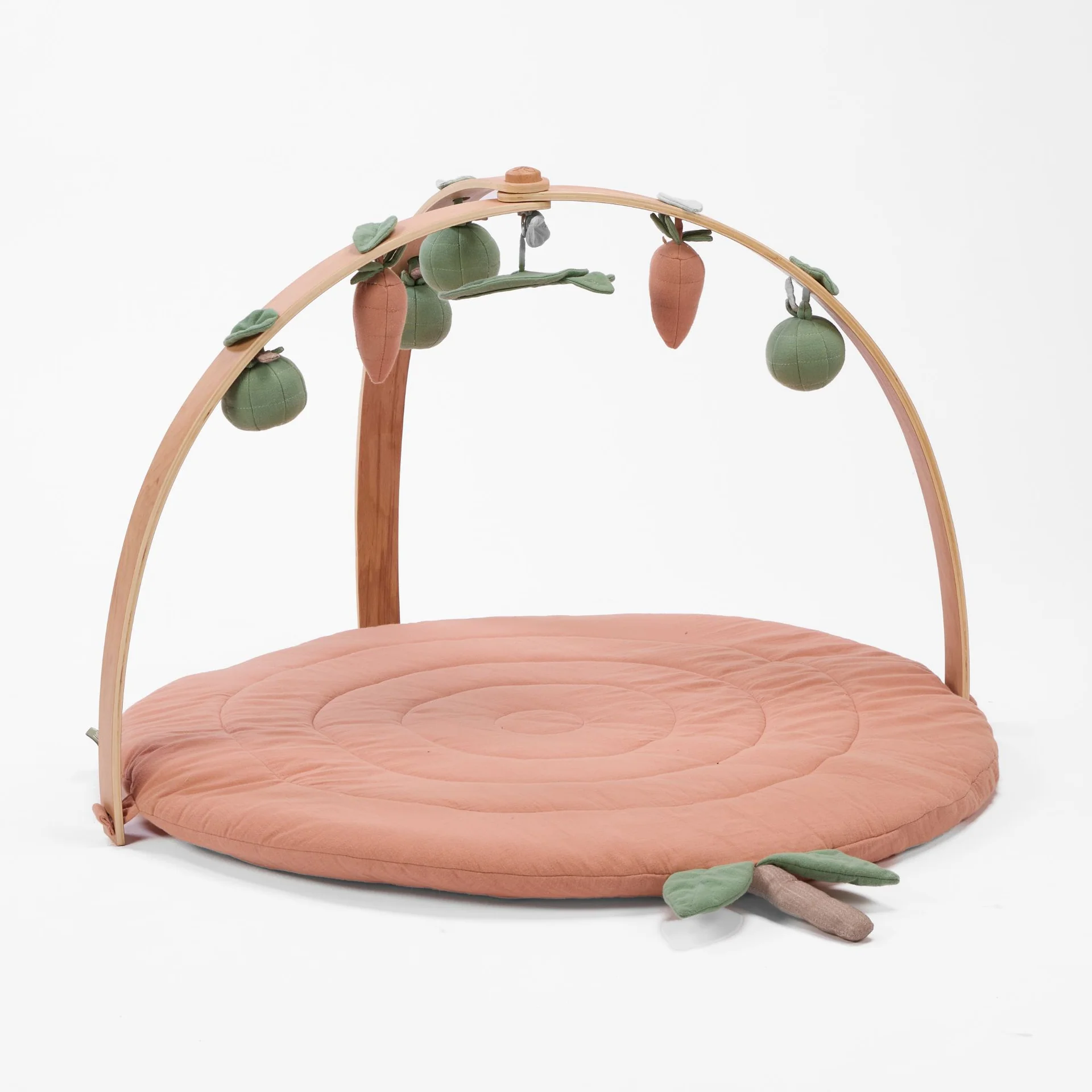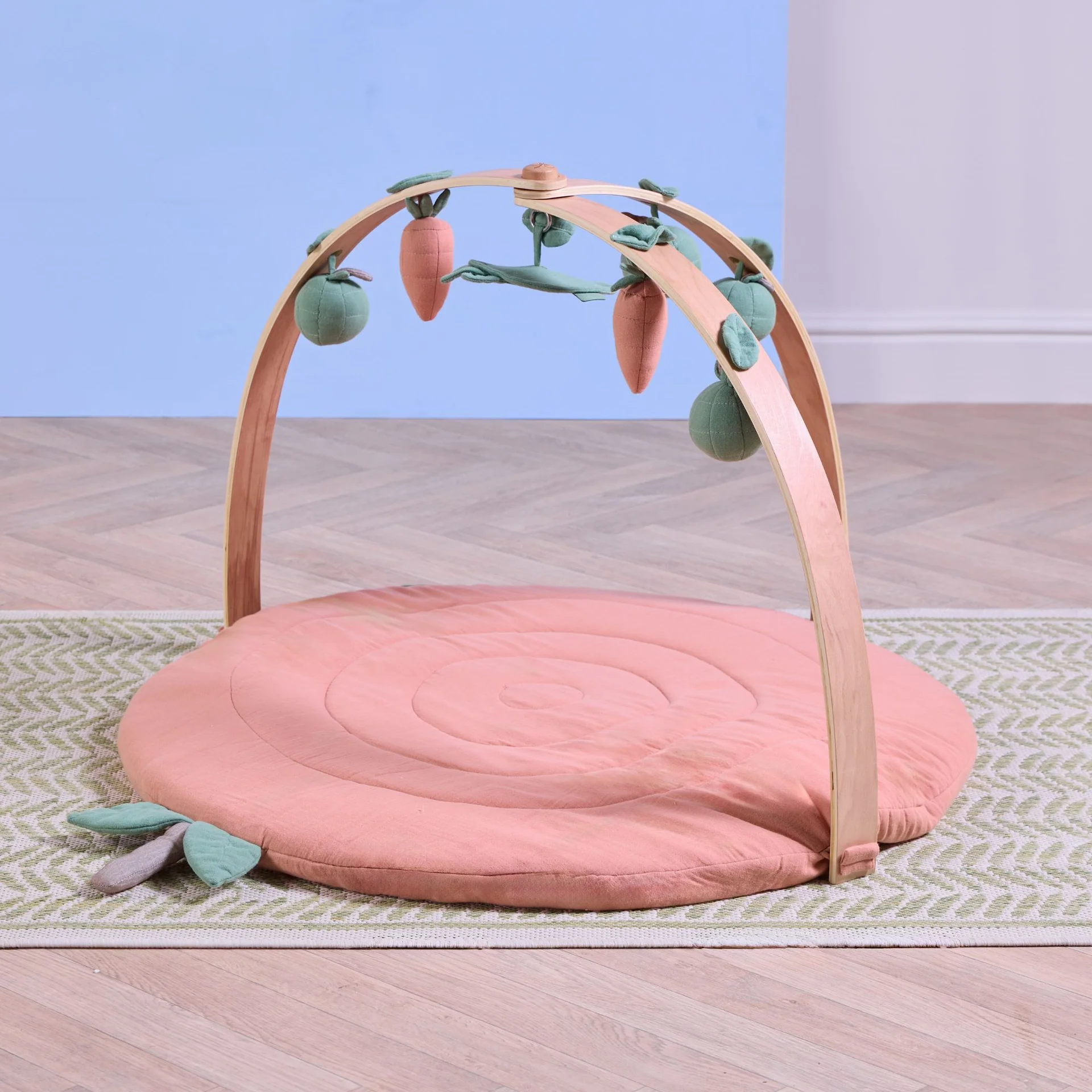 A beautifully crafted wooden arch play gym, perfectly paired with our soft, apple-shaped muslin mat. Soft plush muslin toys in sweet apple and carrot shapes hang gently from the arch, encouraging little hands to reach, grasp, and explore. Thoughtfully designed for sensory play, tummy time, and early development, and elegant enough to remain a charming part of your space all day long. Gentle textures and natural materials make this a timeless favourite from the Good Life collection.