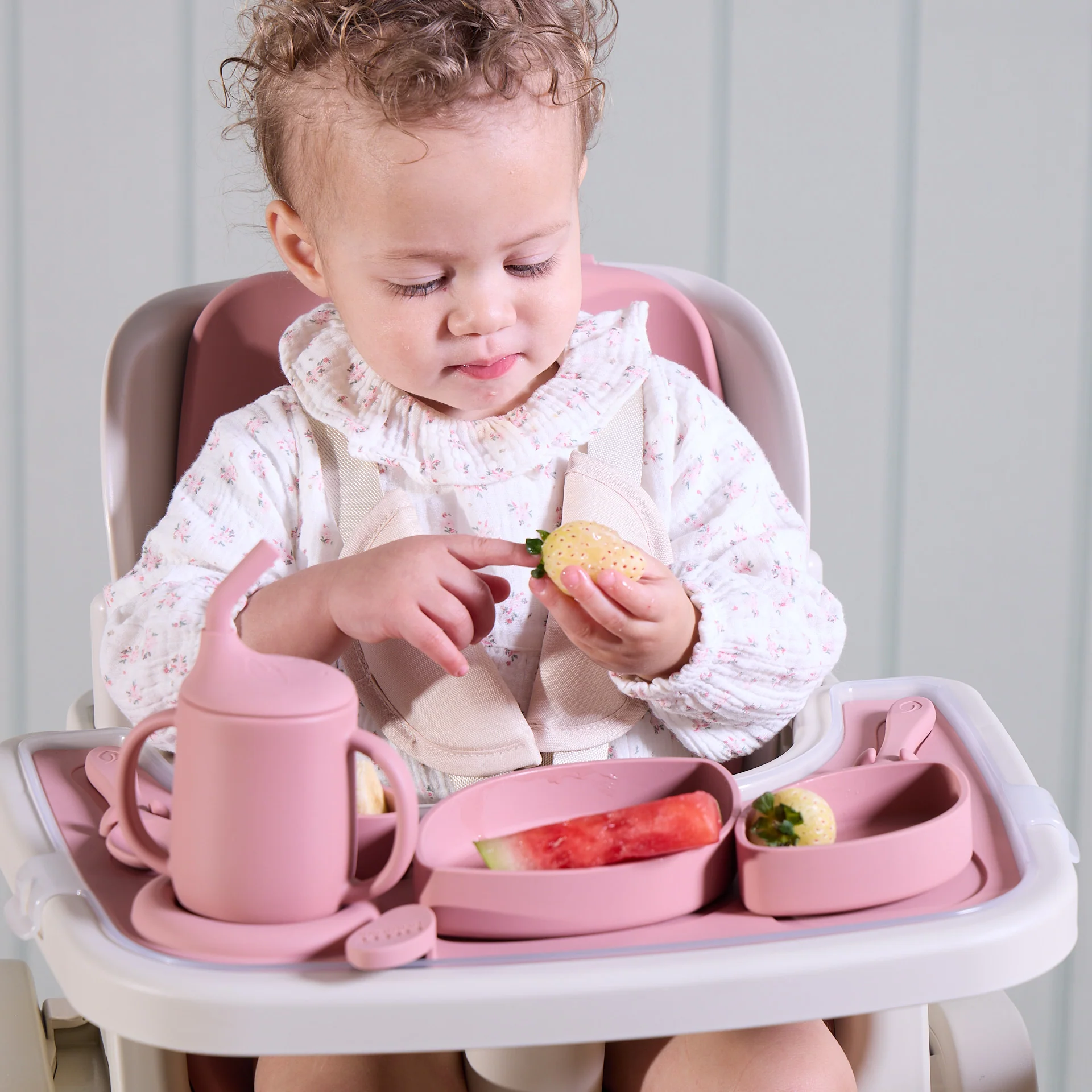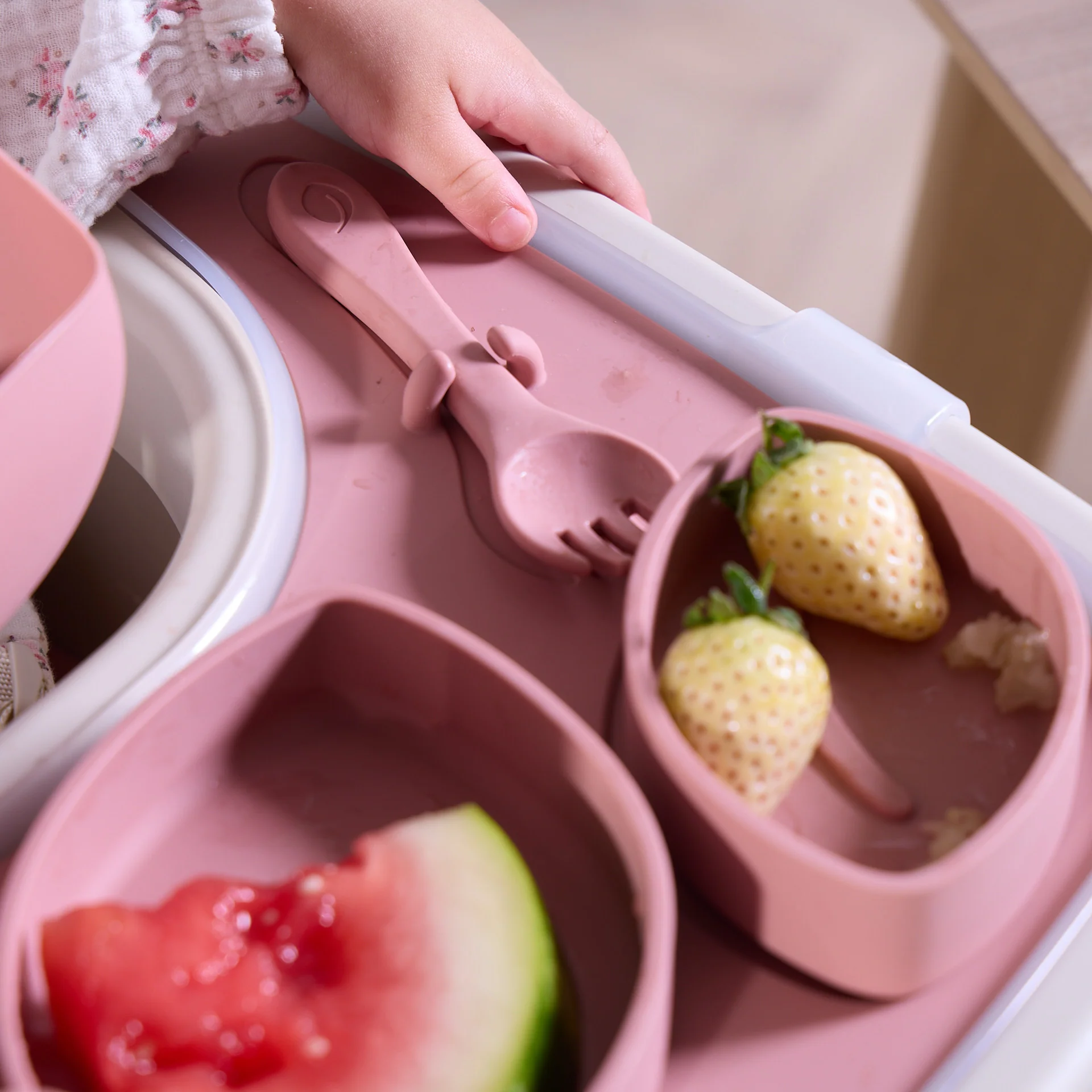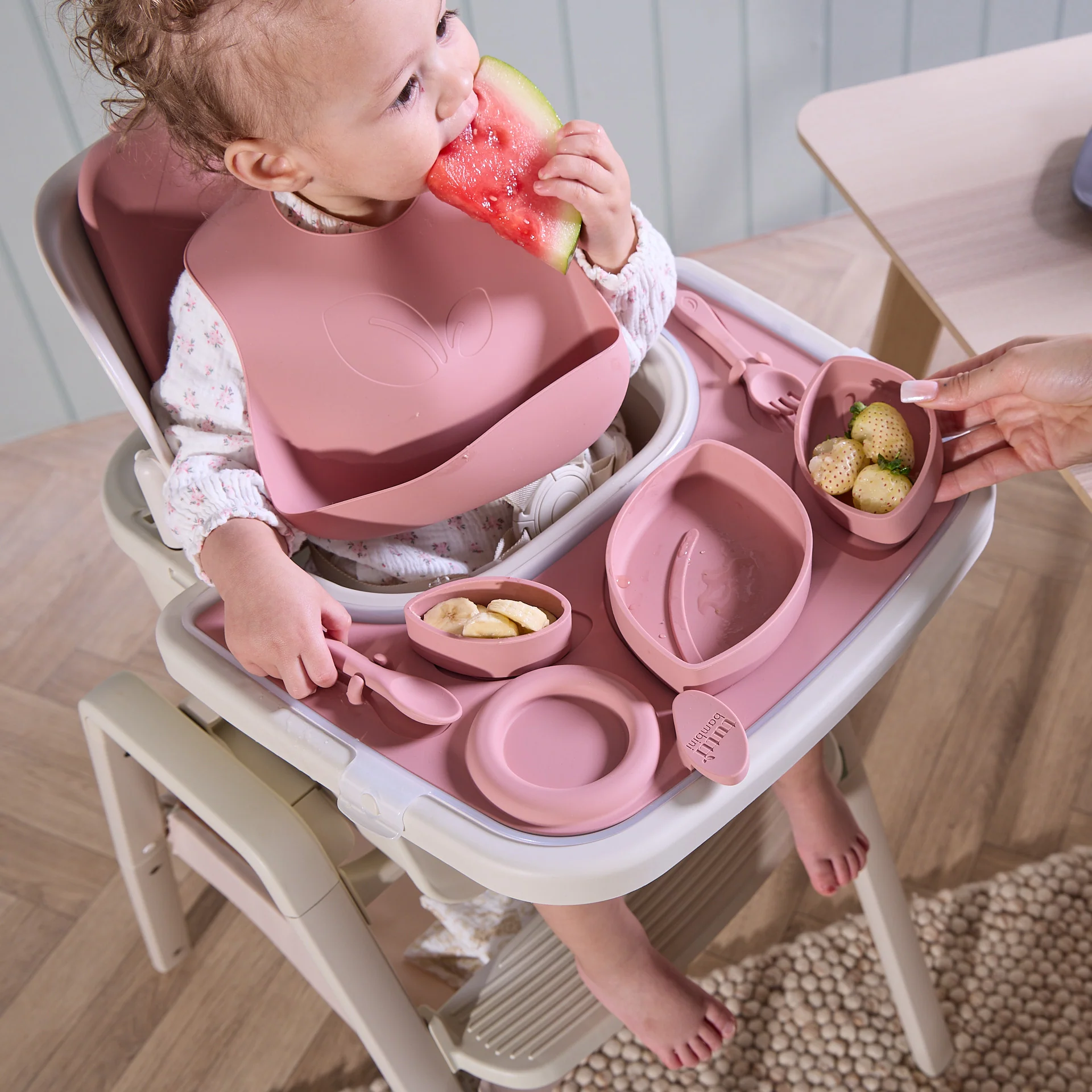 Made from BPA-free silicone, each feeding accessory is safe for everyday use, while the soft seat pads provide added comfort during mealtimes. The set includes a tray, sippy cup, three nesting bowls, fork, spoon, and an easy-clean bib — thoughtfully designed to support your child as they explore food and independence.