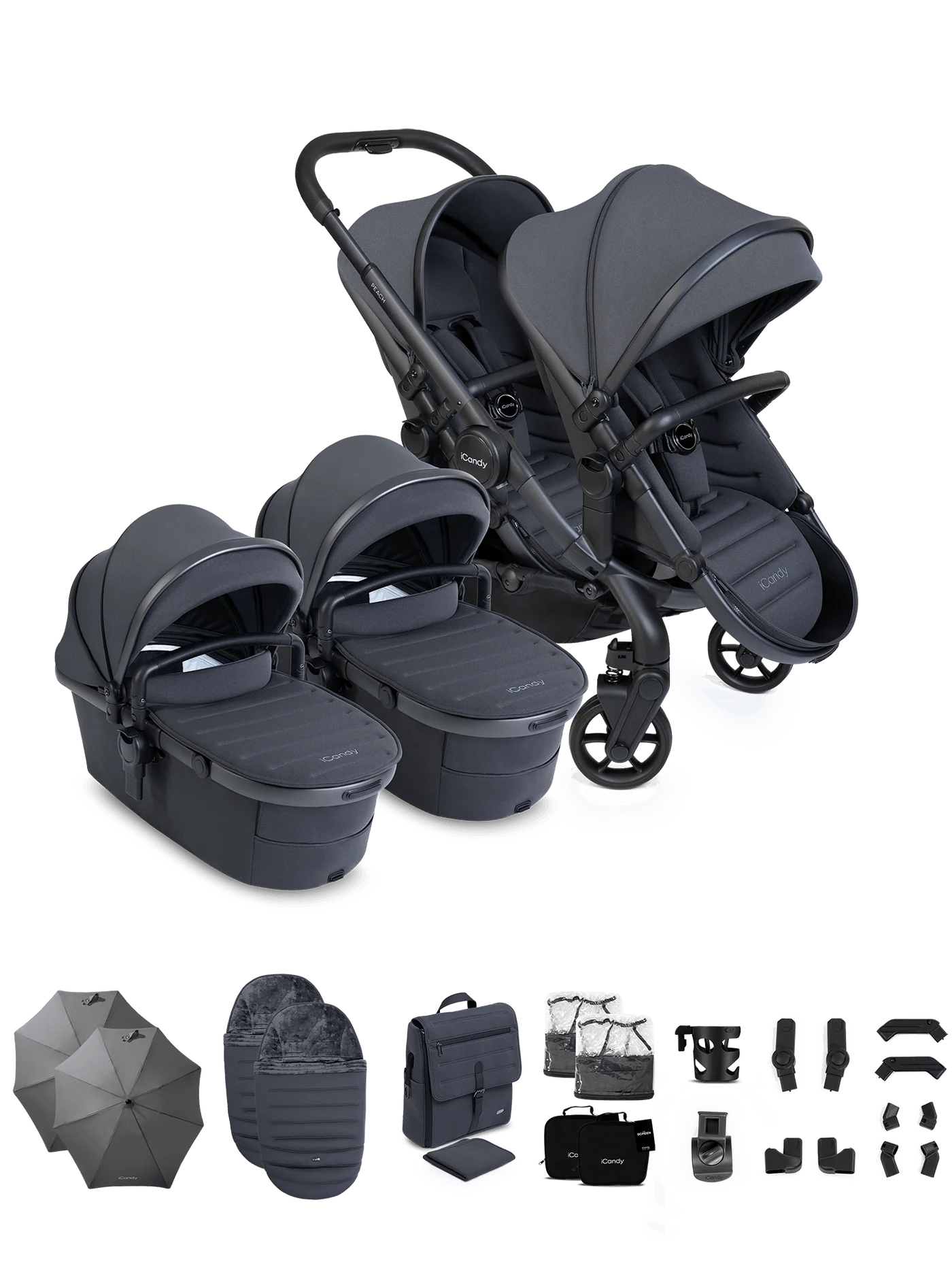 Available in eight contemporary colourways, the iCandy Peach 8 Twin Complete Pushchair Bundle combines cutting-edge design, intelligent functionality and sustainable luxury, providing a coordinated, future-ready solution for families with twins from newborn through toddler years.