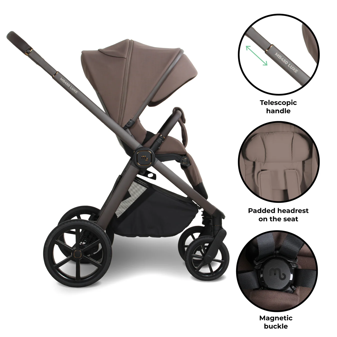 The MB450 Luxe pushchair features a lie-flat recline for ultimate comfort and a large, 3-position extendable canopy, offering perfect protection and shade while keeping your little one cosy on every stroll.