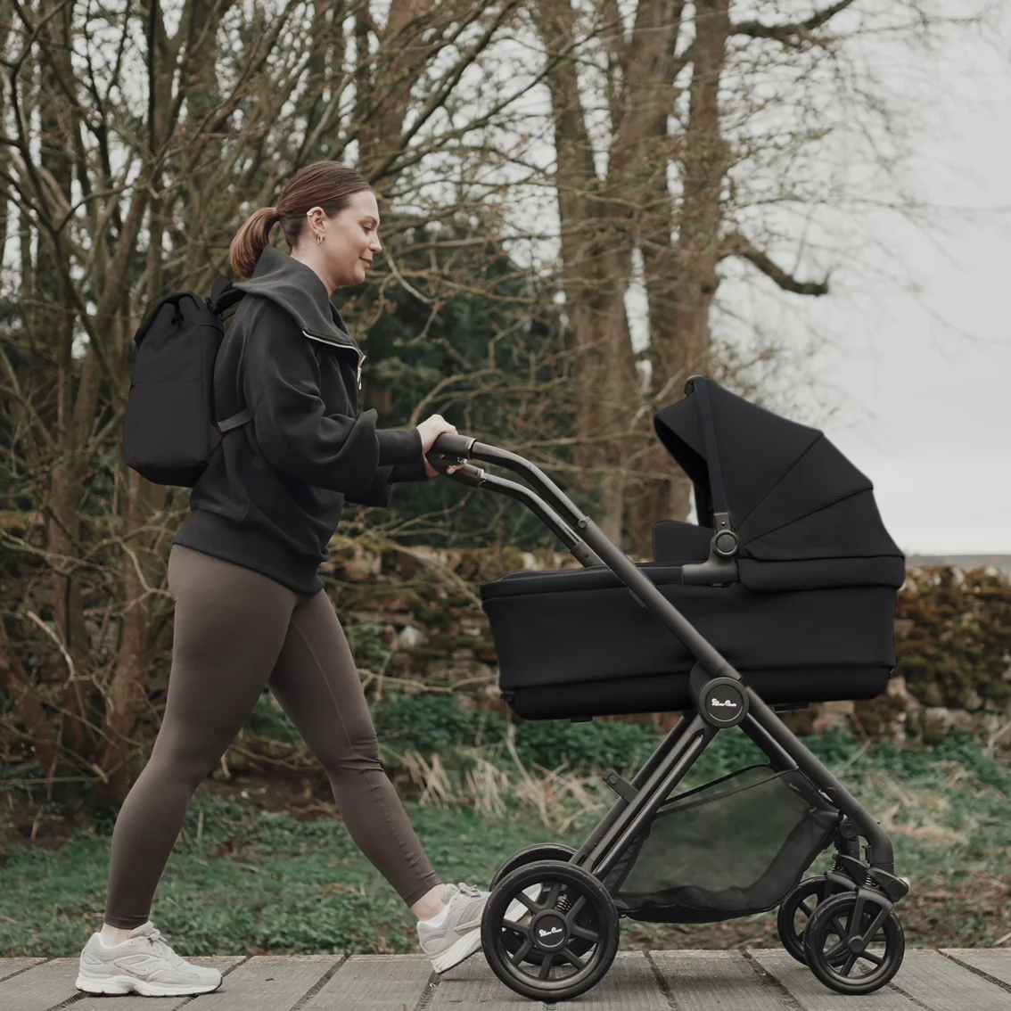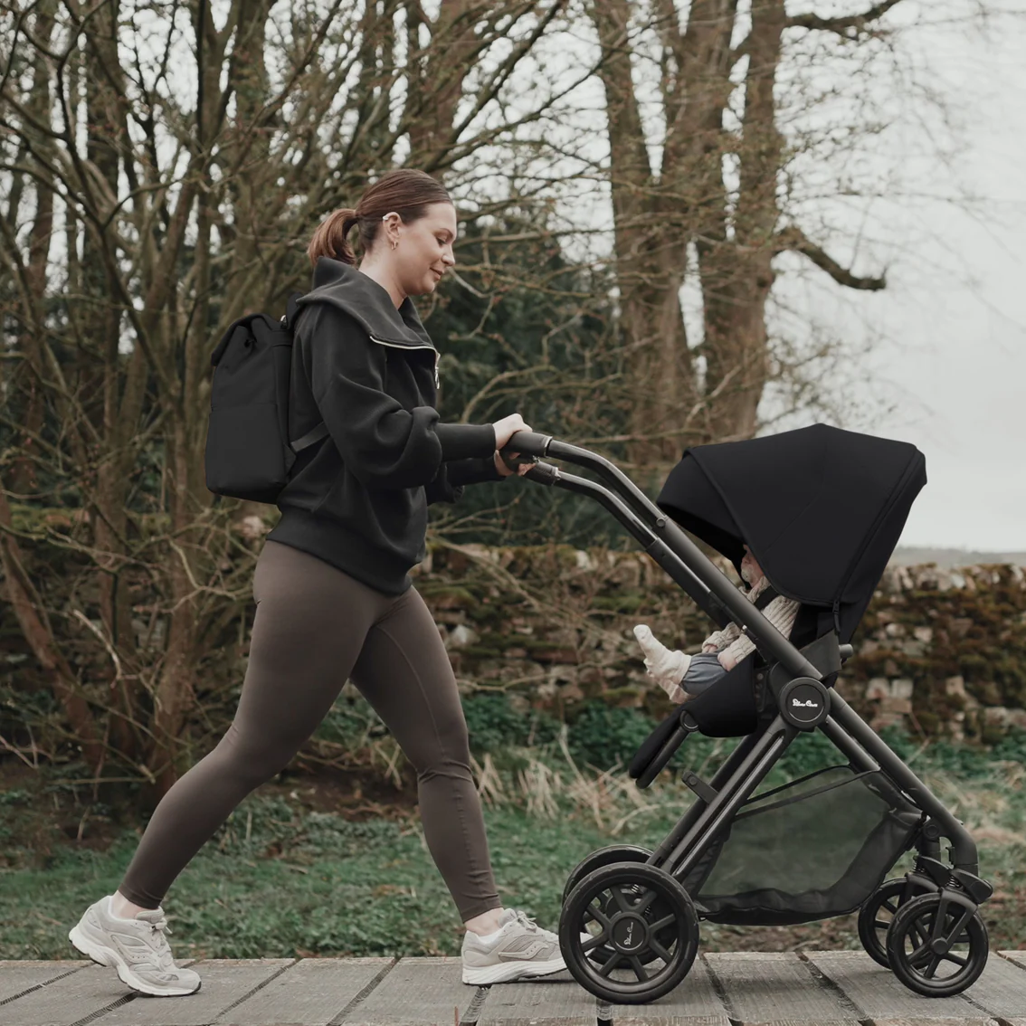 Steering smoothly from suburban streets to countryside footpaths, Reef 2 is the multi-terrain pushchair with the most comfortable ride thanks to its large wheels, softer suspension, a supersized UPF50+ hood and extra-large storage basket. The Reef 2 Ultimate 360 Car Seat Bundle is complete with a folding, overnight sleeping approved, bamboo-lined carrycot, our lie-flat Glide Plus 360 infant carrier, rotating Base Plus 360, coordinating vegan leather changing backpack, thermal puffer jacket-style footmuff, cup holder and phone holder.