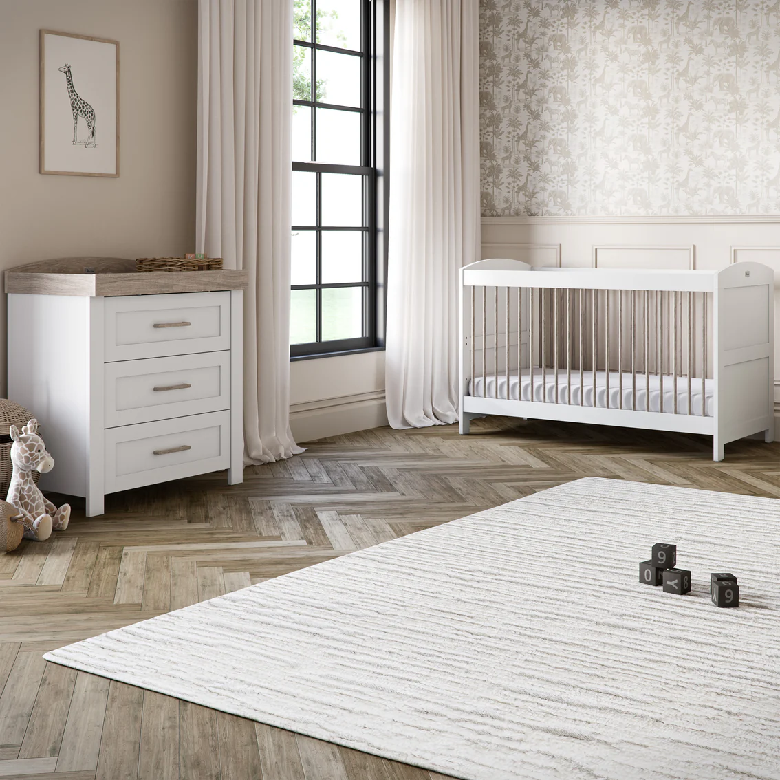 The Valencia 2-piece nursery set is a fresh, neutral canvas for creating your dream nursery. Designed to grow with your child from newborn to toddler, the furniture set includes a cot to toddler bed and a spacious dresser with removable changer top for added longevity. Crafted for durability over the years, the elegant collection features a timeless white finish and natural ash accents.
