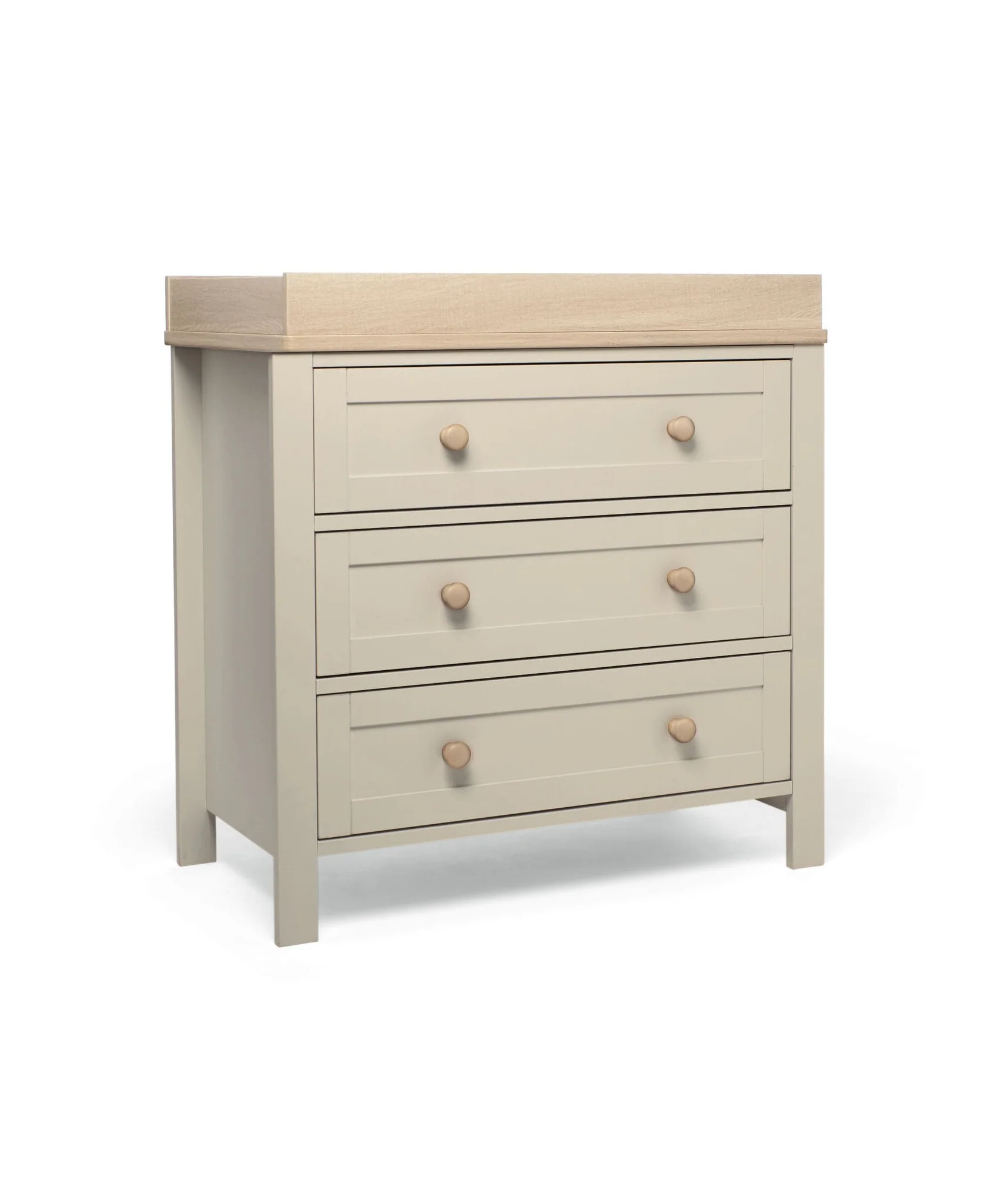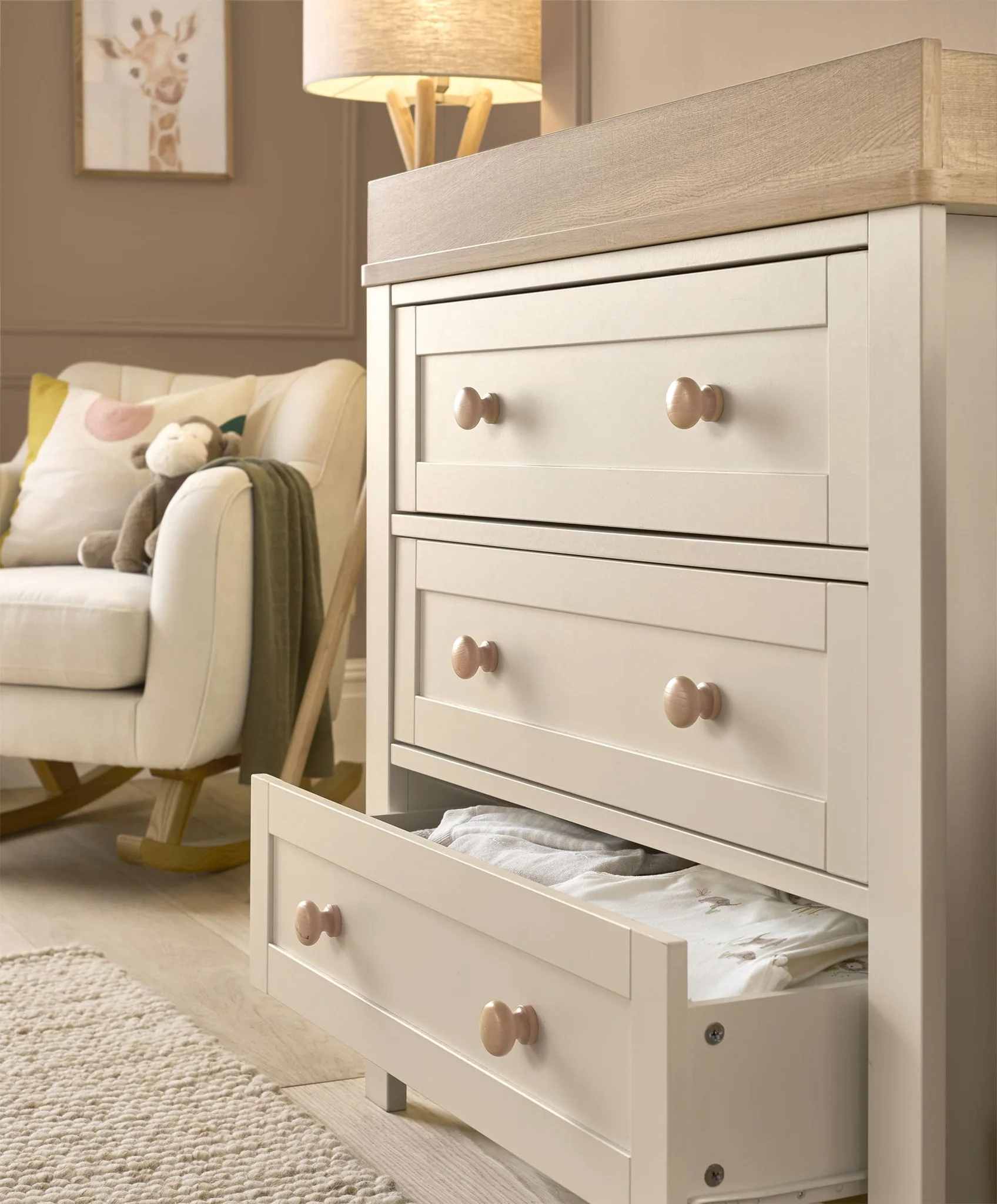 With three full-sized deep drawers on the Wedmore dresser changer, for great storage. Removable changing top allows you to continue using this dresser even when baby’s all grown up, beyond the nursery. In shade, Cashmere, a soft neutral that pairs well with a range of interiors to offer a sophisticated and calming atmosphere.