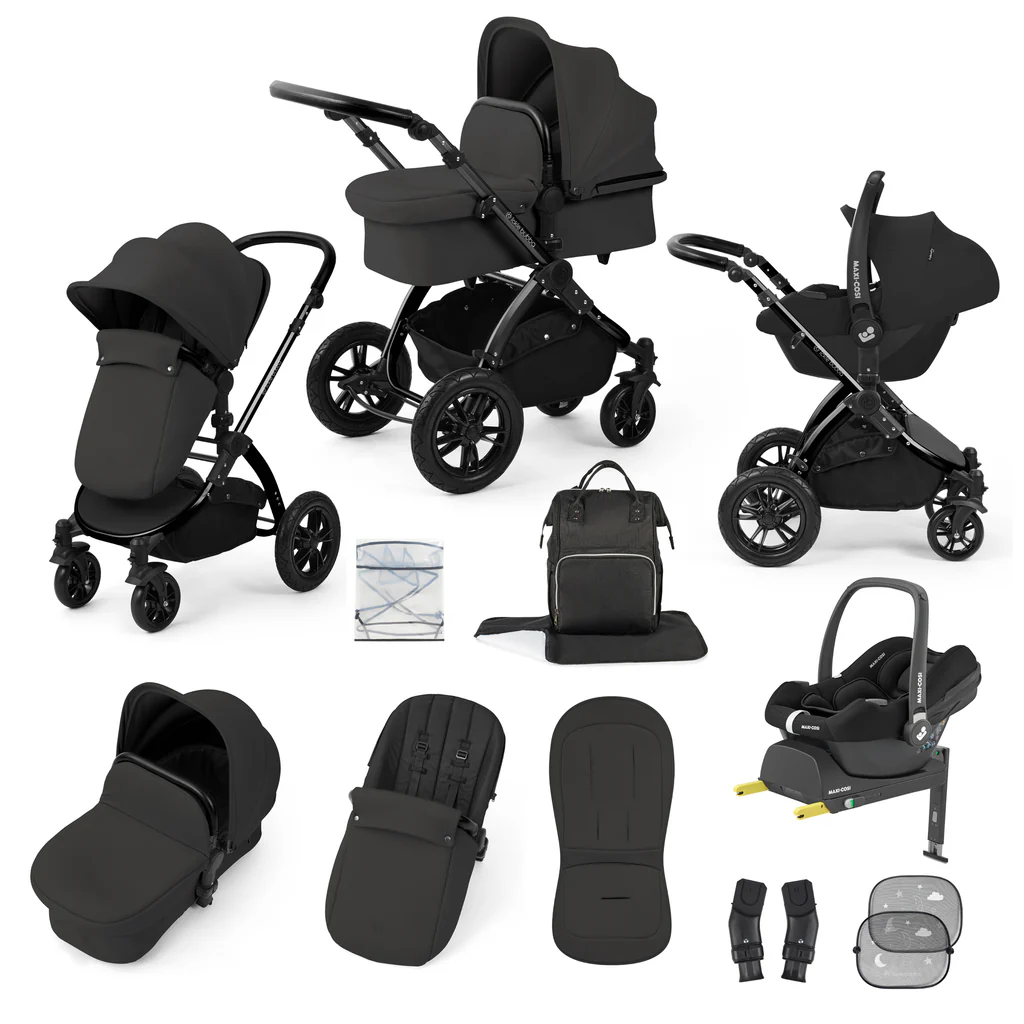 The travel system bundle includes the Stomp Luxe pushchair with seat and carrycot, Maxi-Cosi CabrioFix i-Size Car Seat and ISOFIX Base, car seat adapters, car sunshades, changing rucksack and mat, carrycot apron, footwarmer, seat liner and rain cover.