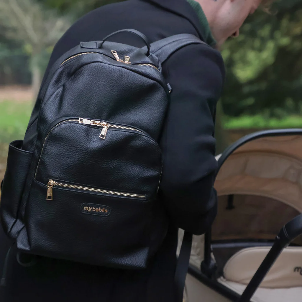 The My Babiie Pro Backpack is the ultimate luxury accessory for modern parenting, combining style, practicality, and versatility. This unisex bag is spacious enough for all baby essentials, with thoughtful features like two insulated bottle holders, elasticated pockets, and a dedicated laptop sleeve for busy parents on the go. Perfect for work, family outings, or the gym, it includes stroller clips for hands-free convenience and side slip pockets for quick access to essentials. The Pro Backpack also includes a removable waterproof pouch—perfect for carrying essentials—that doubles as a stylish crossbody bag, plus a luxury padded changing mat for on-the-go nappy changes.. Durable metal feet, chunky YKK zips, and adjustable padded straps ensure premium quality and comfort. Available in striking Gunmetal and Bronze, the Pro Backpack is designed to keep you organised, stylish, and ready for anything.