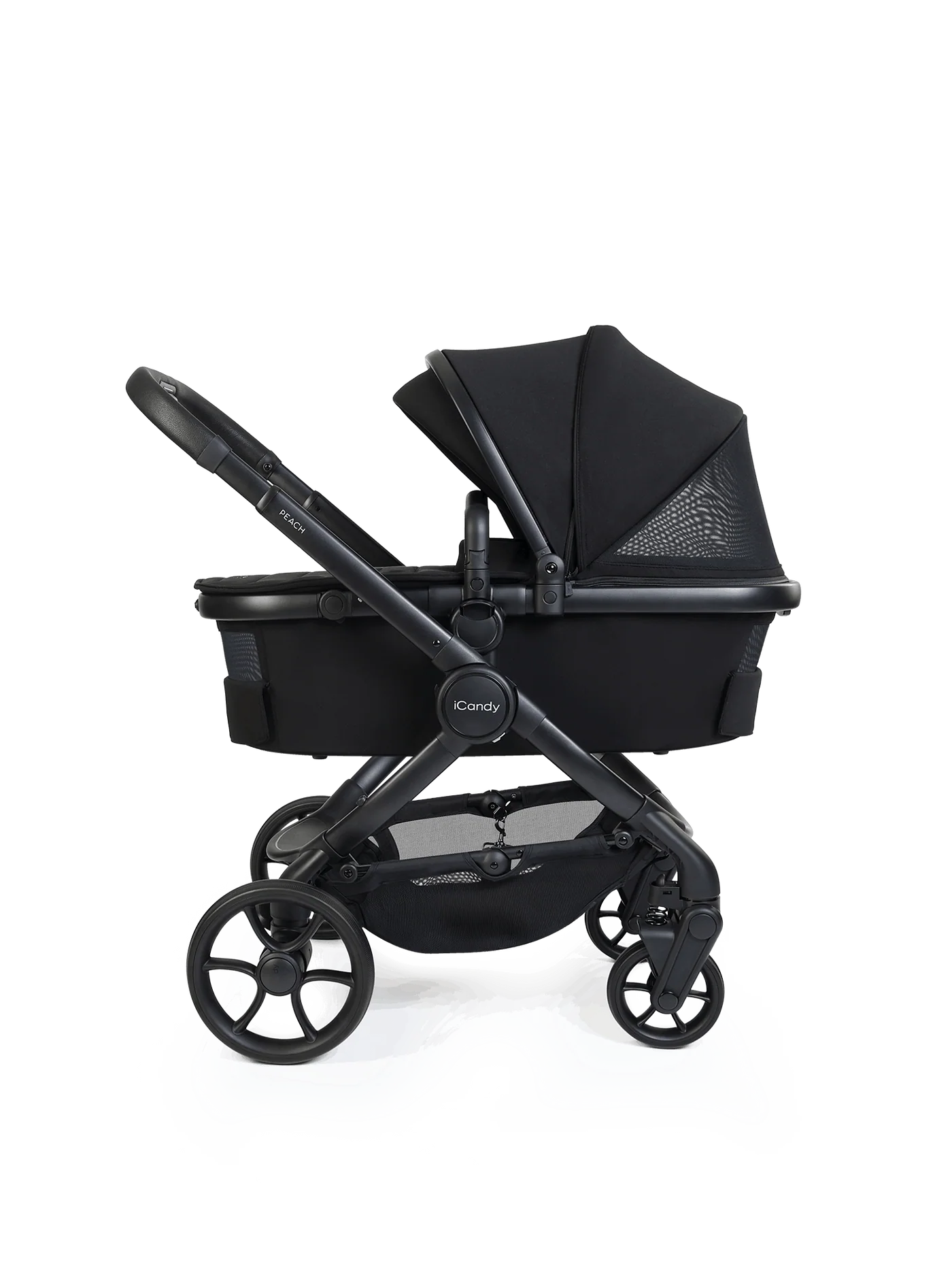 The spacious, collapsible Peach 8 carrycot has been redesigned to provide increased airflow and is approved by The Lullaby Trust for permanent overnight sleeping, including when used with the compatible iCandy MiStand. Advanced suspension, puncture-proof tyres, an extendable canopy with UPF protection, ergonomic one-hand release system, flip-flop friendly brake and integrated Ride-on Board ensure a smooth, comfortable ride across all terrains.