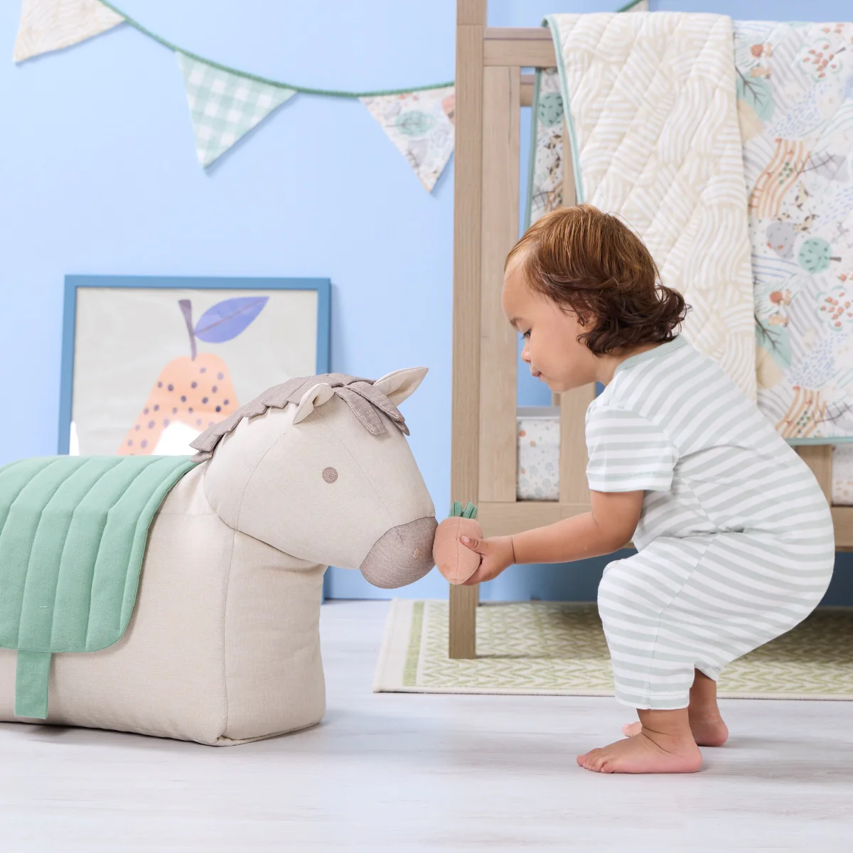 Galloping straight from the storybook stables, Henry the Ride-On Bean Bag Horse is your little one’s soft and steadfast companion, ready for endless adventures, big or small. Lovingly crafted from soft cotton muslin with a huggable feel, Henry brings comfort, charm, and imagination to every nursery and playroom. Whether your little cowboy is riding through imaginary fields or curling up for story time, Henry is more than a seat – he’s a friend, a comfort, and a timeless piece of nursery decor. A beautiful blend of soft play, cosy seating, and whimsical design, Henry inspires little dreamers to climb on, sit tall, and let their adventures begin.