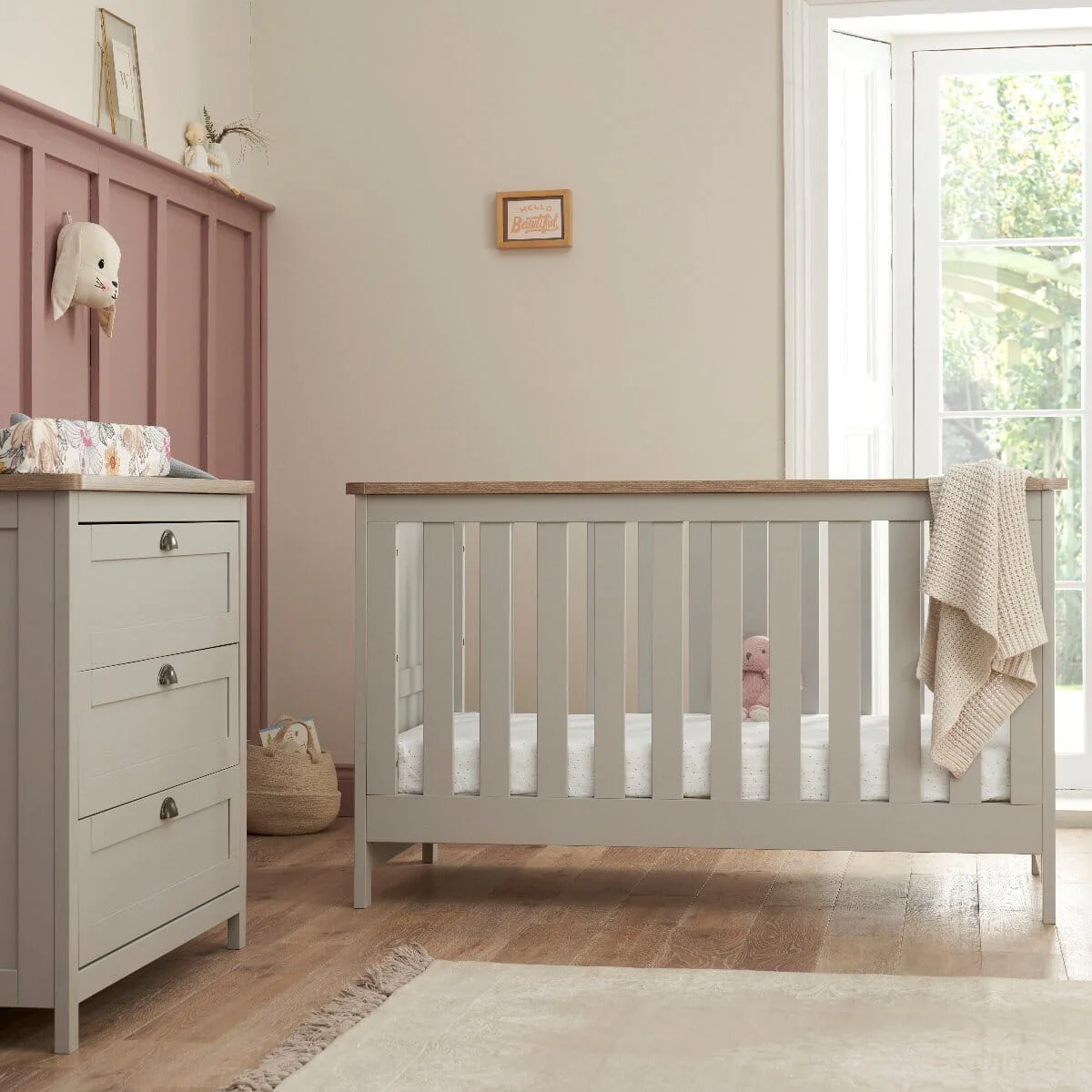Designed with clean lines and finished in Dove Grey and Oak, the Verona Two Piece Nursery Room Furniture Set promises a beautiful traditional look for your nursery. The shaker style chest changer features a fully removable changing top and the matching cot bed converts to junior bed and day bed, making this nursery set suitable for years to come.